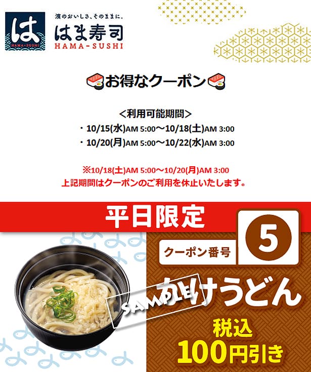 はま寿司の公式アプリから「公式アプリクーポン(10/15~10/21)」が配布されています。