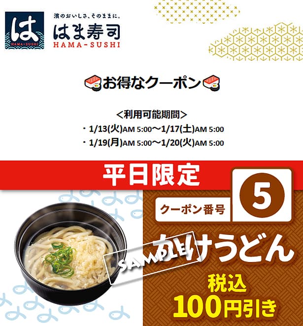 はま寿司の公式アプリから「公式アプリクーポン(1/13~1/20)」が配布されています。