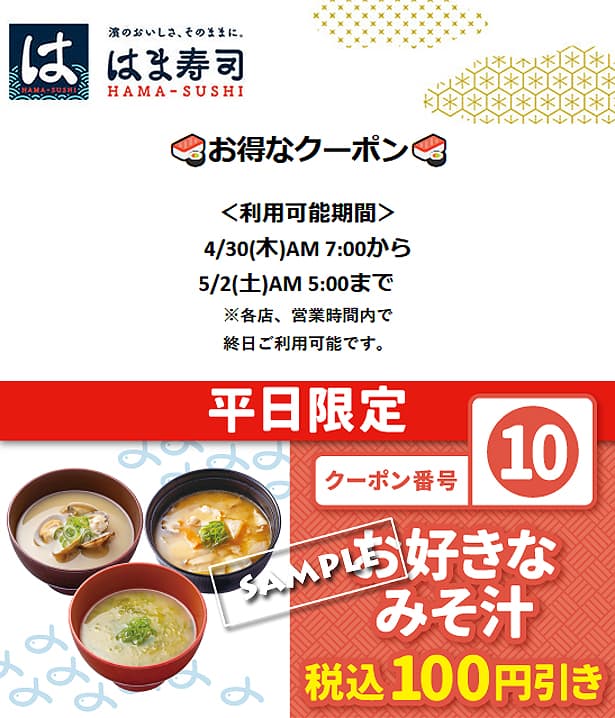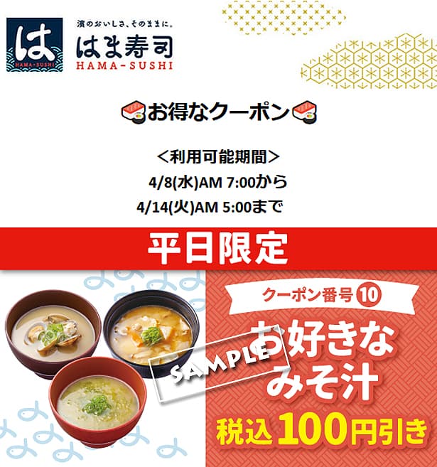 はま寿司の公式アプリから「公式アプリクーポン(4/8~4/14)」が配布されています。