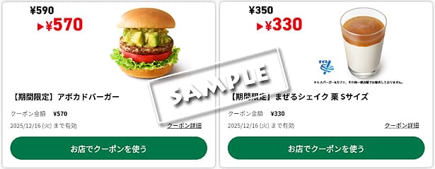 モスバーガーの公式アプリから「公式アプリクーポン(11/12~12/16)」が配布されています。