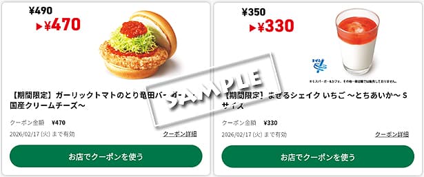 モスバーガーの公式アプリから「公式アプリクーポン(1/28~2/17)」が配布されています。