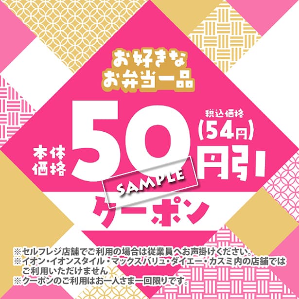 セルフレジ店舗でご利用の場合は従業員へお声掛けください。キッチンオリジン、オリジン弁当でご利用いただけます。イオン、イオンスタイル、マックスバリュ、ダイエー、カスミ内の店舗ではご利用いただけません。クーポンのご利用はお一人さま一回限りです。